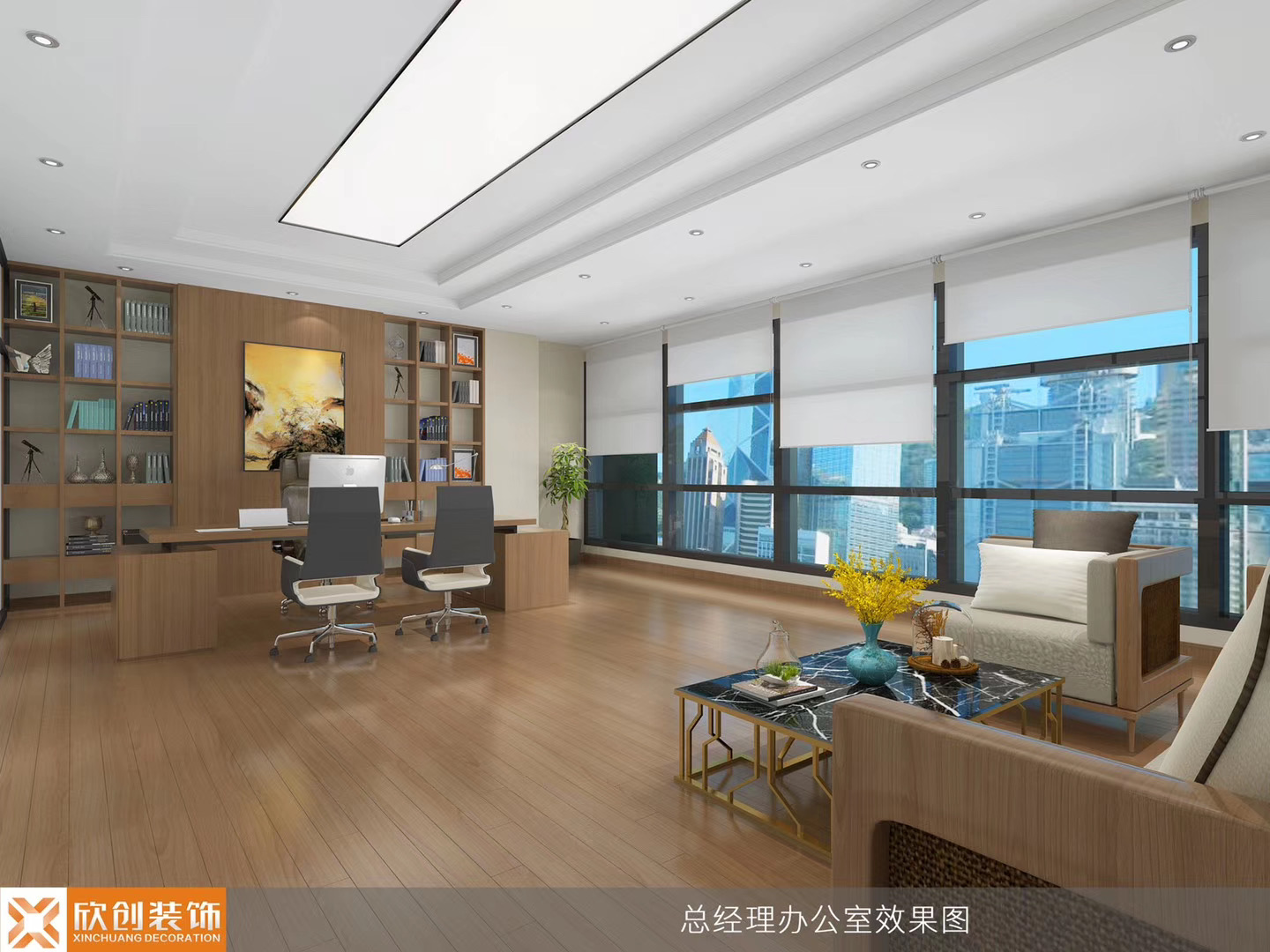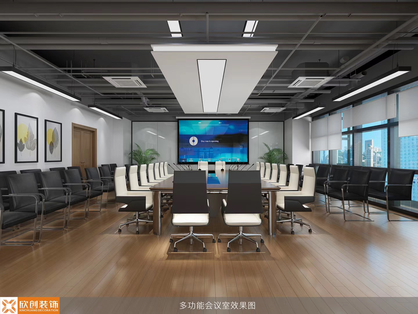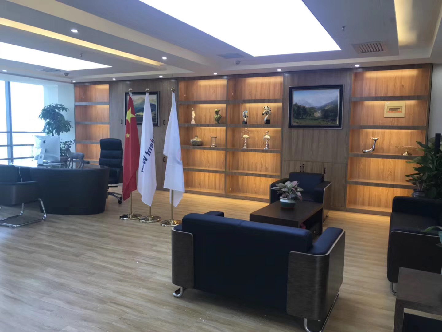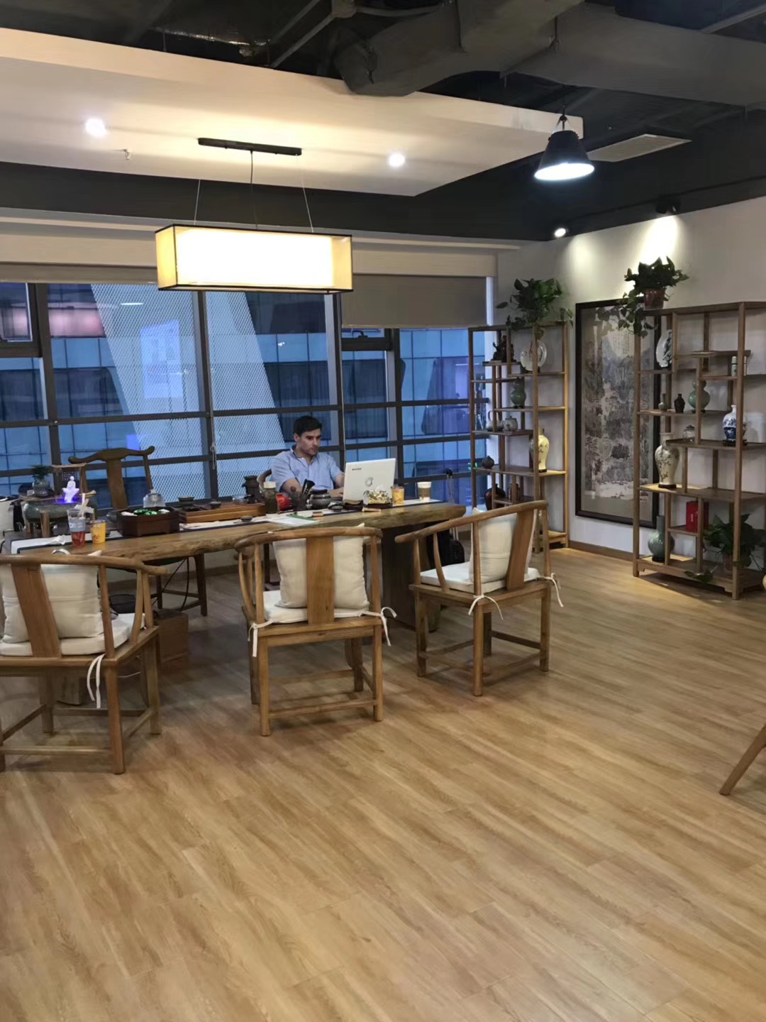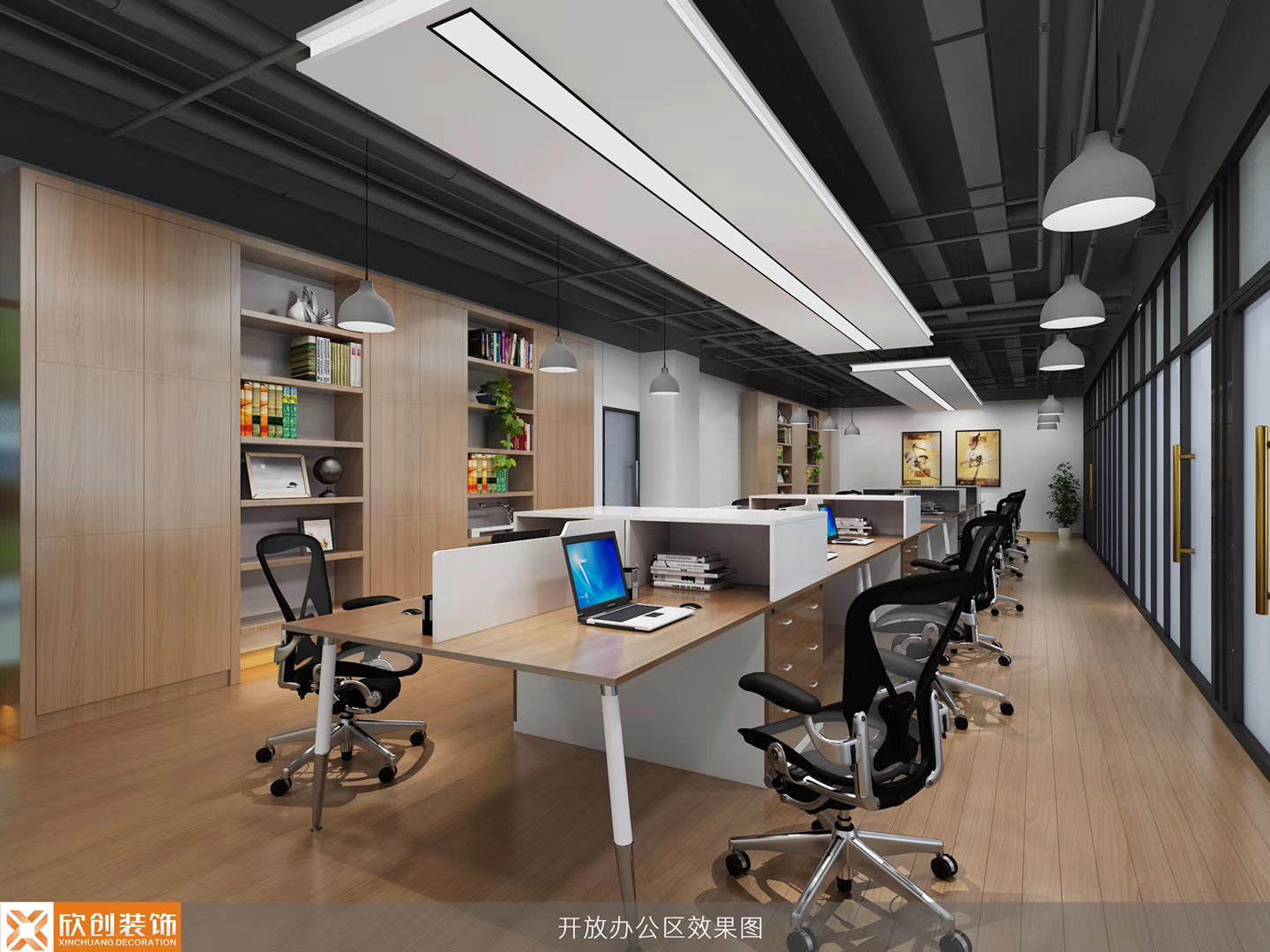 三、办公区域顶面采用长方形白色吊灯和圆形吊灯结合,打破空间的沉闷,增加趣味性。