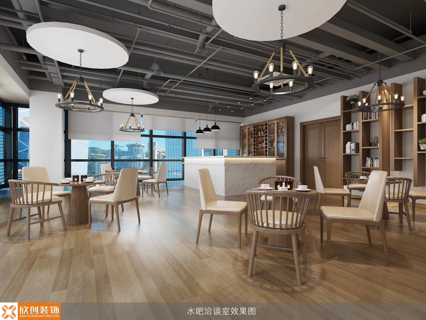 二、水吧洽谈室是高级的棕色与白色结合,空间搭配新颖实用,桌椅分布时尚实用,给员工、老师一个良好舒适洽谈环境。