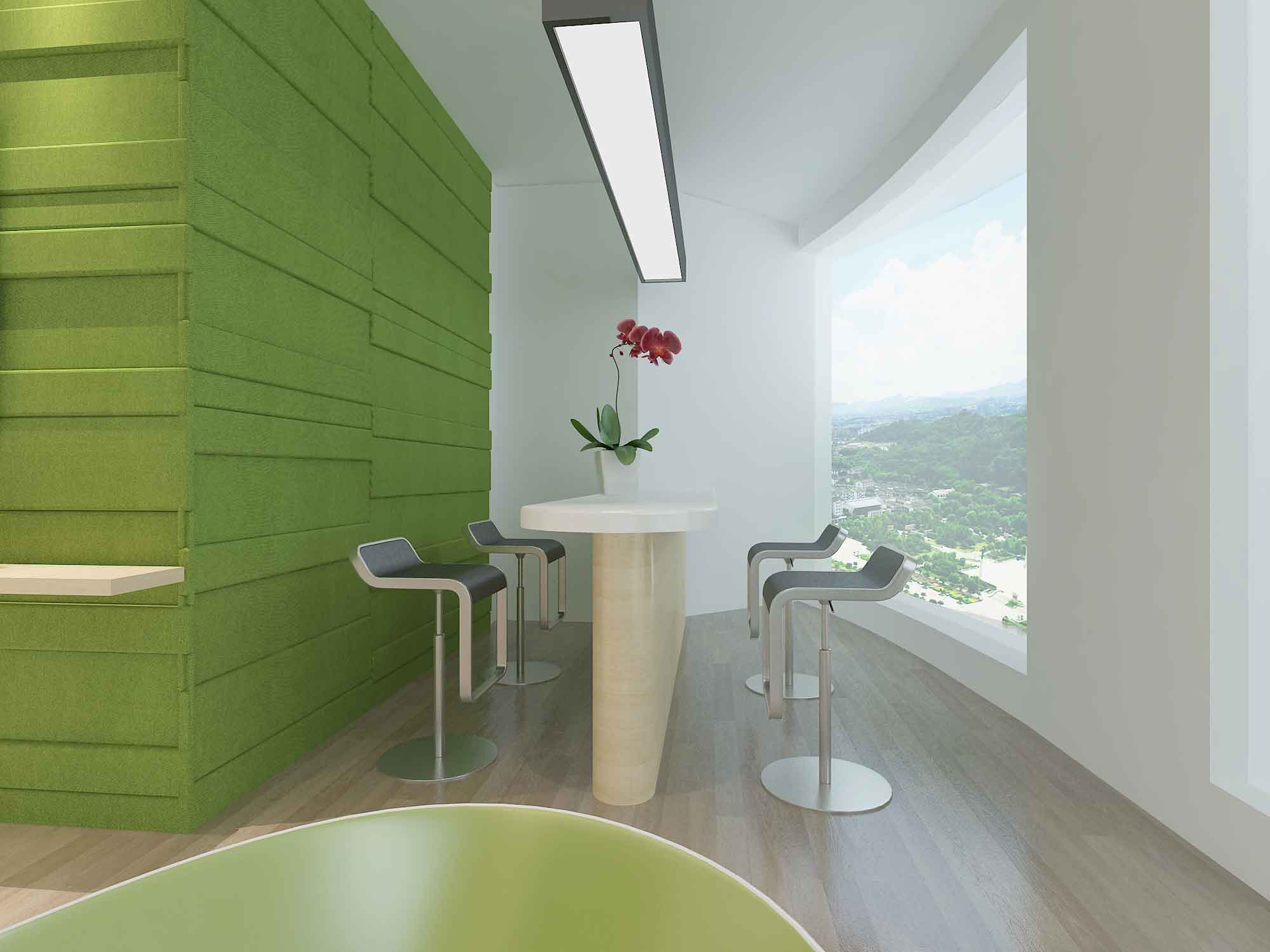 而且考虑到室内整体的采光效果,搭配以白加绿的组合,同时摆上一些绿植,邀约客户进入室内的时候能给人视觉上的眼前一亮,同时也利于缓解工作时的视觉疲劳。