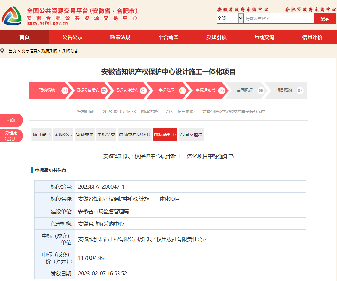 热烈祝贺安徽欣创装饰工程有限公司与知识产权出版社有限责任公司联合体成功中标:安徽省知识产权保护中心设计施工一体化项目